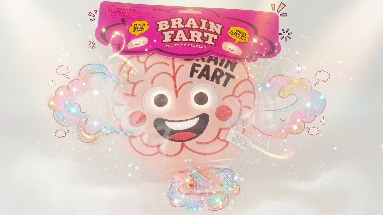 This soft plush whoopee cushion features a smiling cartoon brain on the front, ready to deliver a loud and proud "brain fart" at just the right moment.