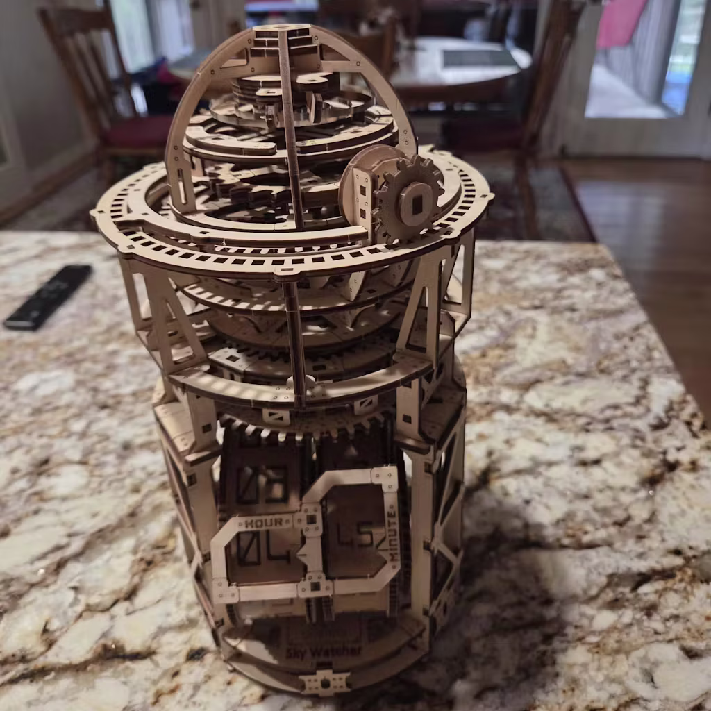 Building this clock was a huge challenge for me. At first, I could only get it to run for about three hours. But after disassembling it several times, applying wax, and sanding some parts—especially the hour-hand mechanism—I finally got it to work! As the photo shows, it ran for an incredible 6 hours and 25 minutes with the engine turned off! After tweaking a lot with the pendulum, I was also able to achieve a difference of only 4 seconds compared with a stopwatch over that entire period!! This is a fantastic piece of engineering, and there were times I truly felt like a clockmaker. It gave me many hours of fun during and specially after its assembly. Thank you again, Ugears! You're geniuses!