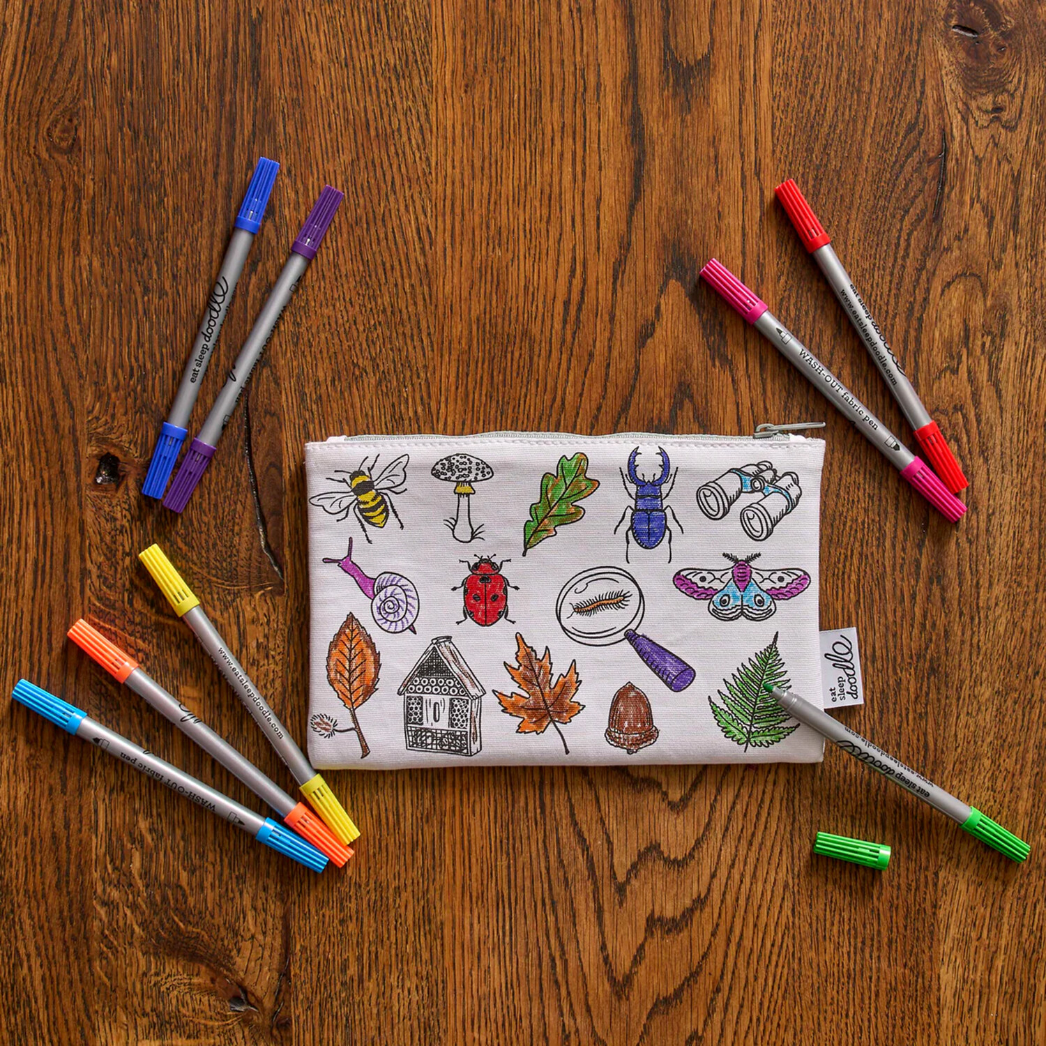 This reusable pencil case includes 10 double-ended washable fabric markers.