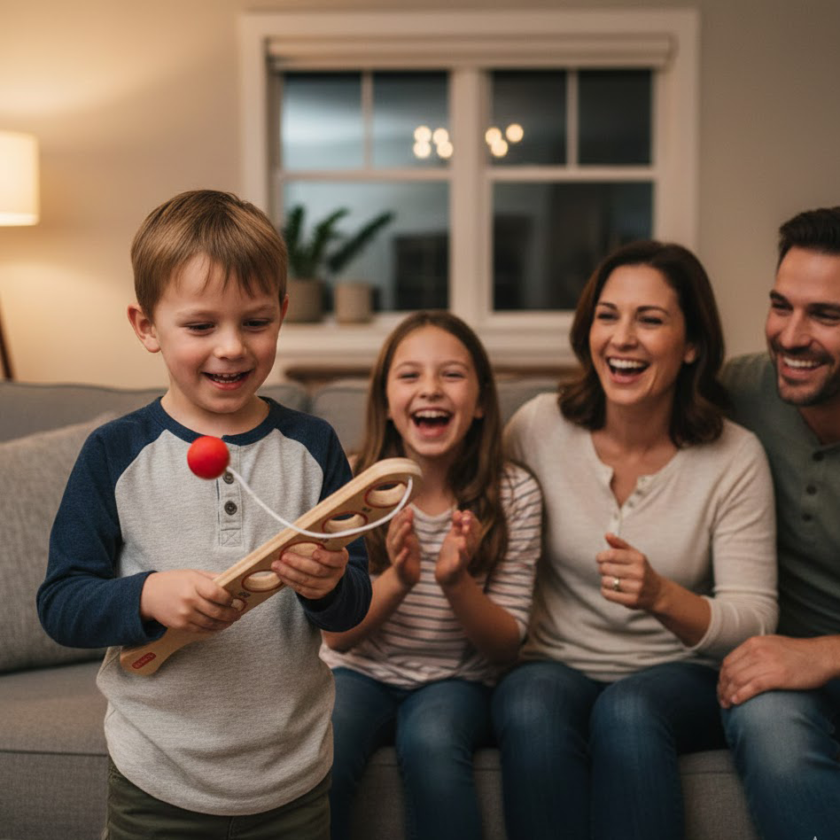 Designed for children aged 5 and up, you'll score points by flipping the stick and manoeuvring the attached wooden ball.