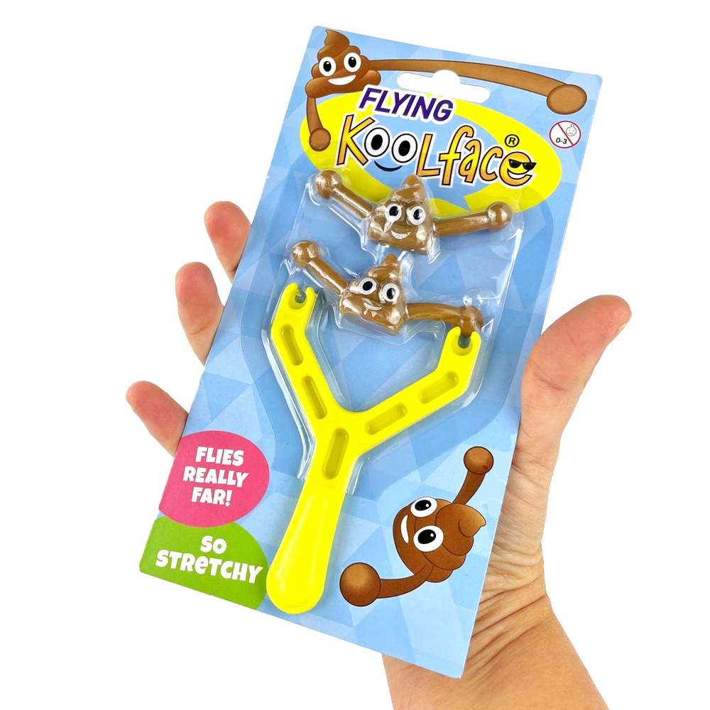 Your pack includes: 1 x Bright yellow sling shot and 2 x Novelty Smiling Koolface Poo.