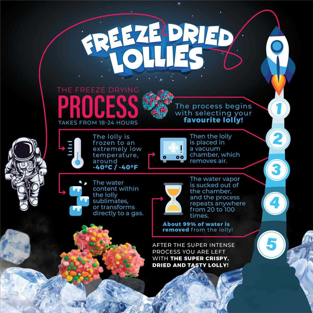 And, if you're scratching your head about how they work... It all starts with super cold temperatures, as low as -40 degrees. Then, in a special vacuum chamber, the water inside the candies turns straight into vapour - a process that's repeated until we achieve candy perfection. And guess what? This fantastic process takes place in our very own backyard, Australia.