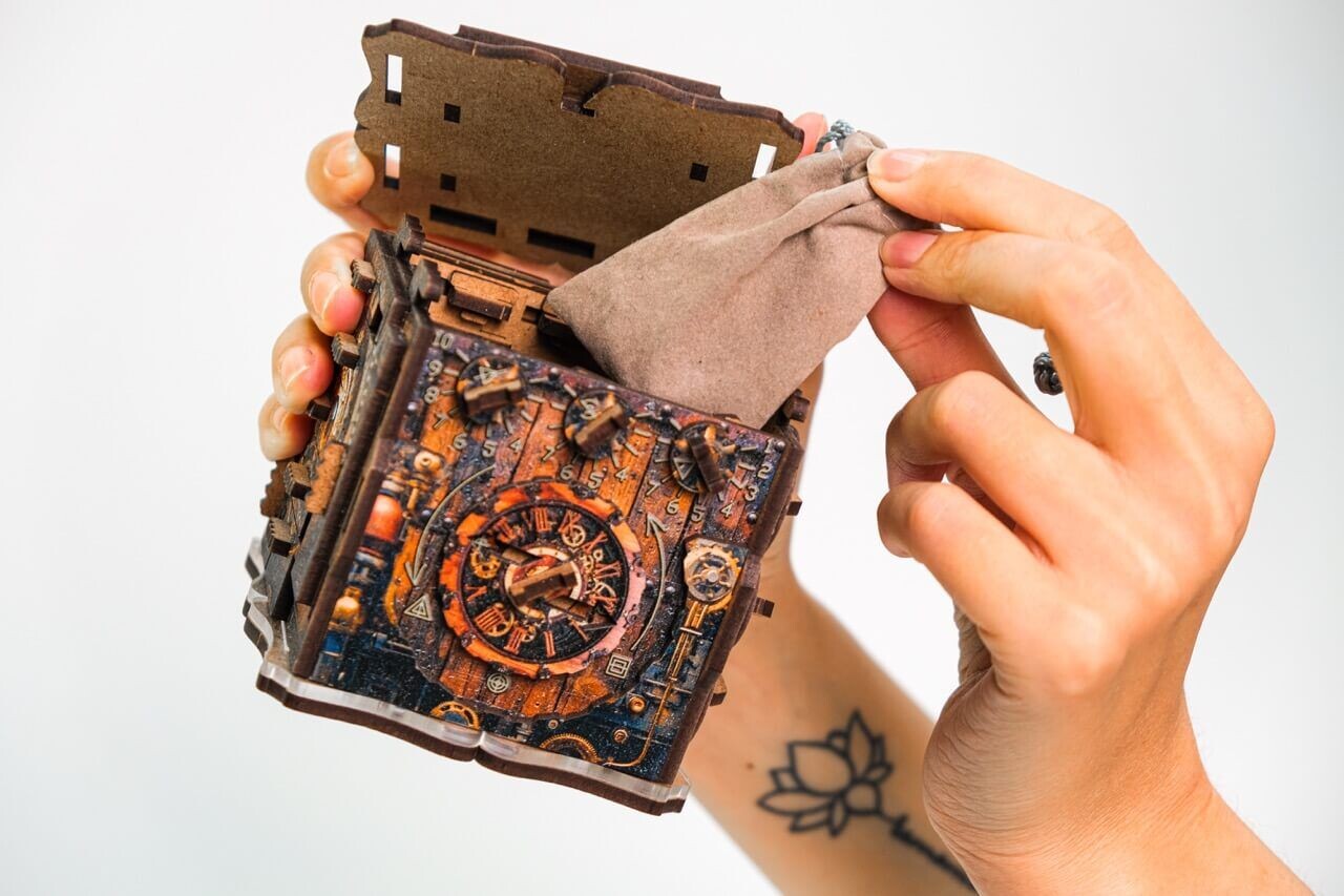 As the puzzle unfolds, players solve a series of mechanical steps that slowly reveal the hidden space inside measuring 5cm x 5cm x 6cm.