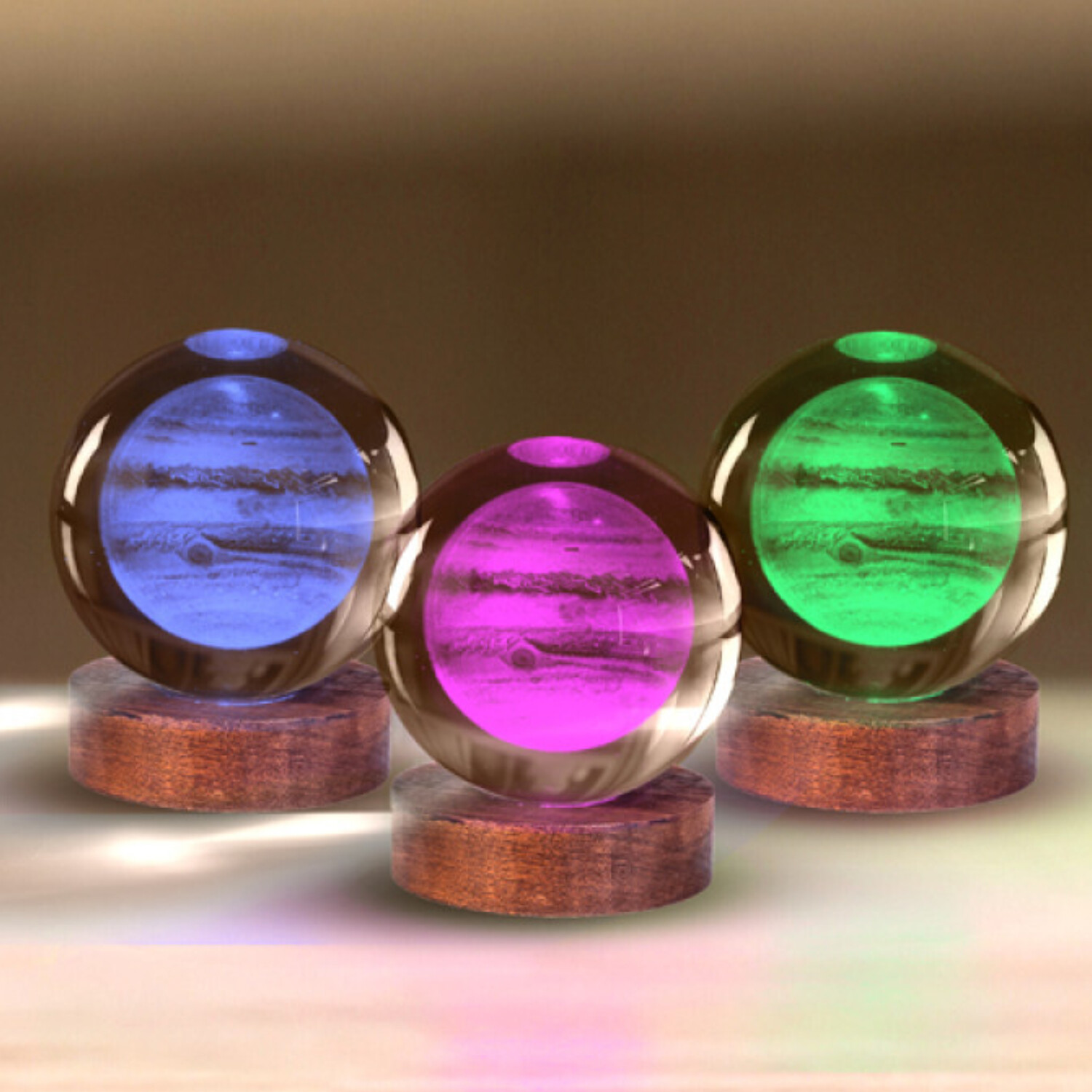 Inside the solid glass orb, Jupiter’s swirling storms and iconic bands are laser-engraved in incredible detail, glowing to life with colour-shifting LED's.