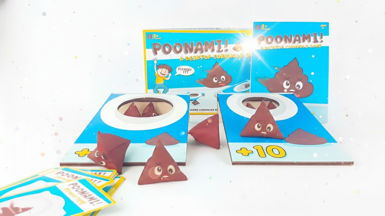 The Poonami Desktop Cornhole Game suits birthdays, family game nights, and anyone who appreciates bold toilet humour.