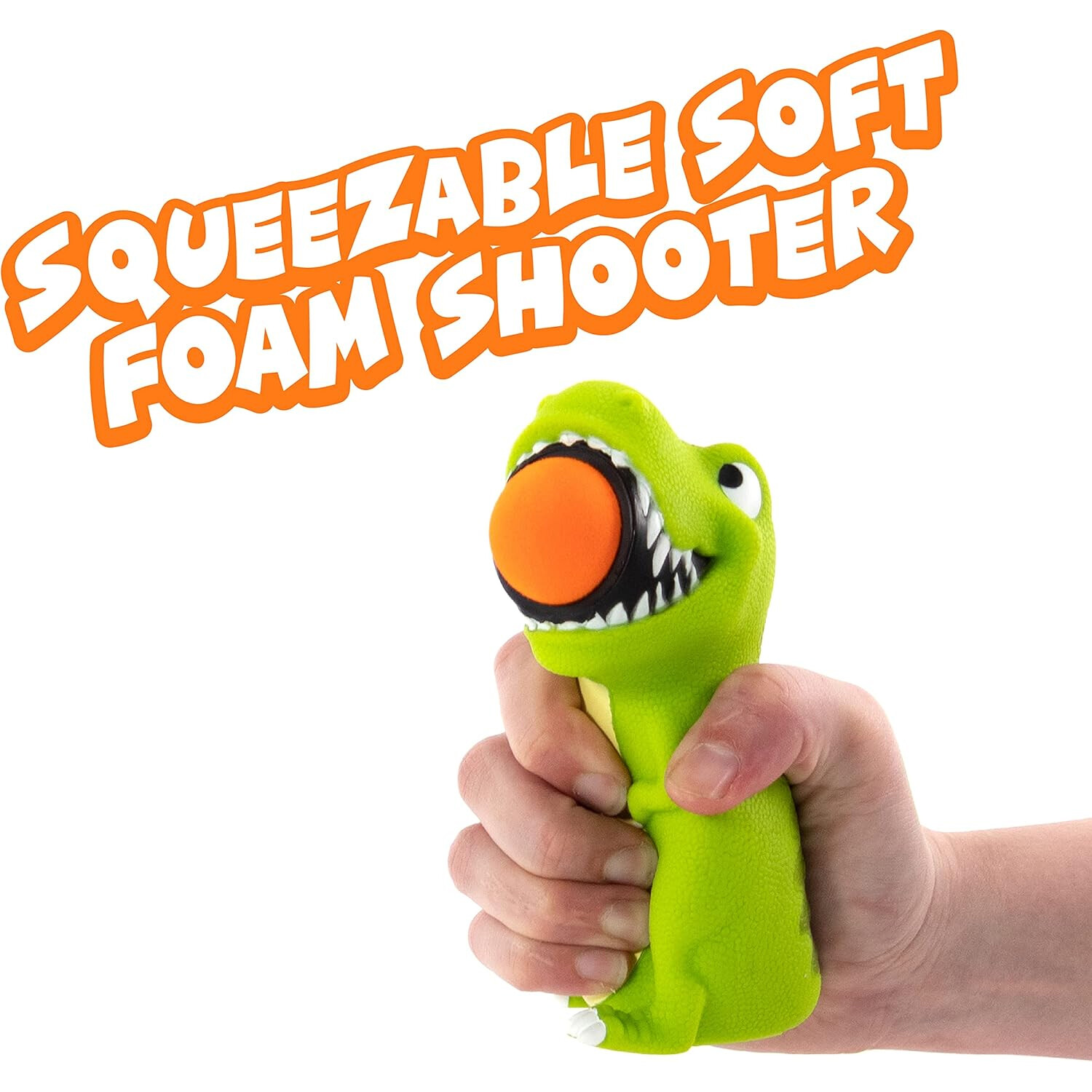 Load the foam ball into the T Rex mouth, squeeze its belly, and watch the ball pop across the room.