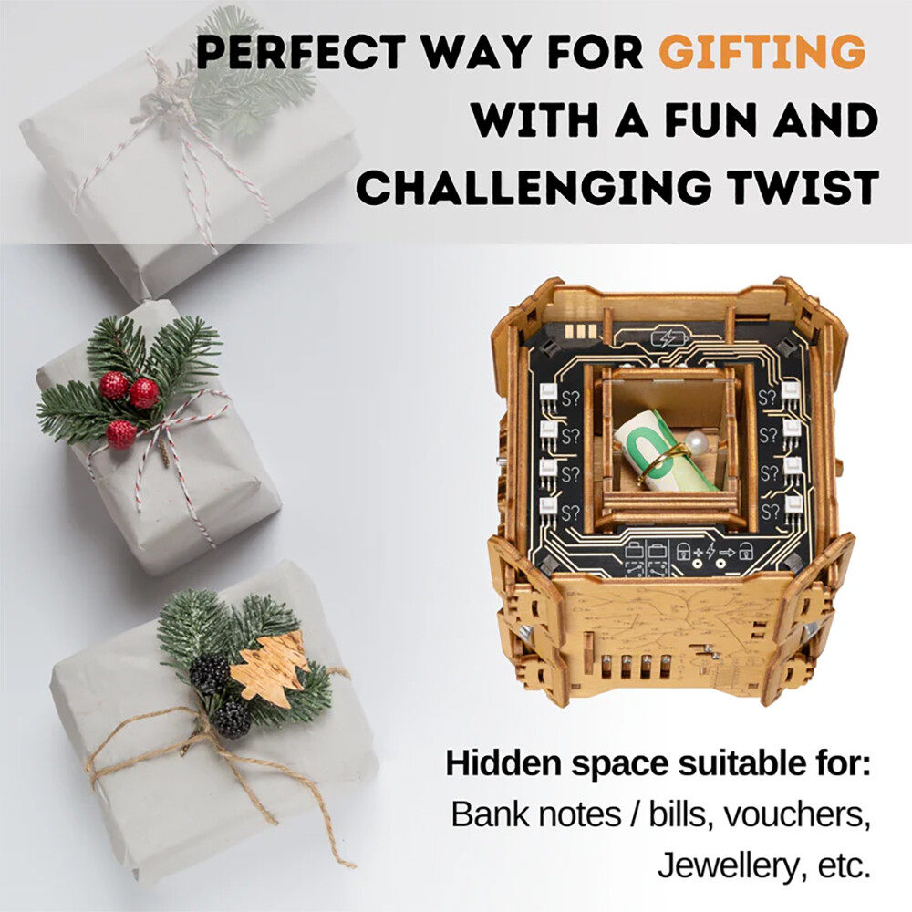 Inside lies a secret compartment for hiding cash, jewellery, or other small treasures - but unlocking it requires wit, patience, and clever thinking!