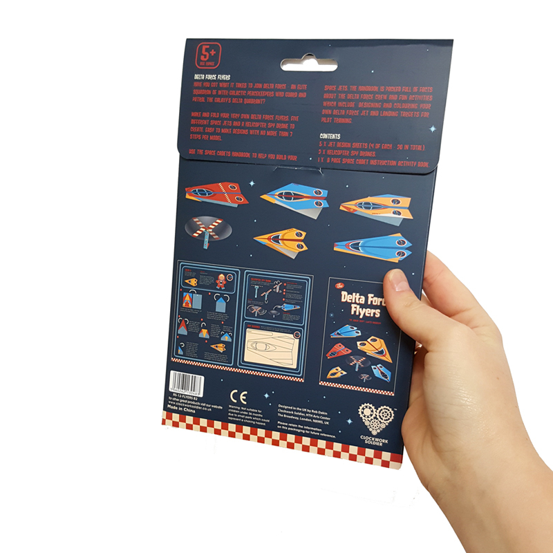 Use the included Space Cadets Handbook to help you fold the prints correctly! Your special handbook also includes fun activities for you to complete such as designing and colouring your own Delta Force Jet and a target for practicing your flying skills. It's a great activity for rainy days!