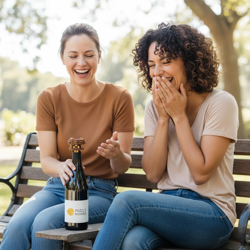 This tricky puzzle attaches to any wine bottle and creates a multi-step challenge that will have friends laughing, guessing, and maybe begging for hints.