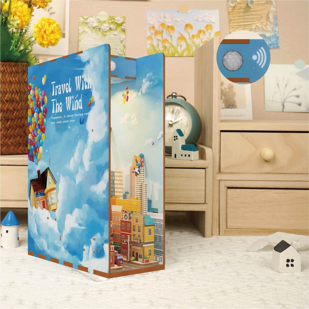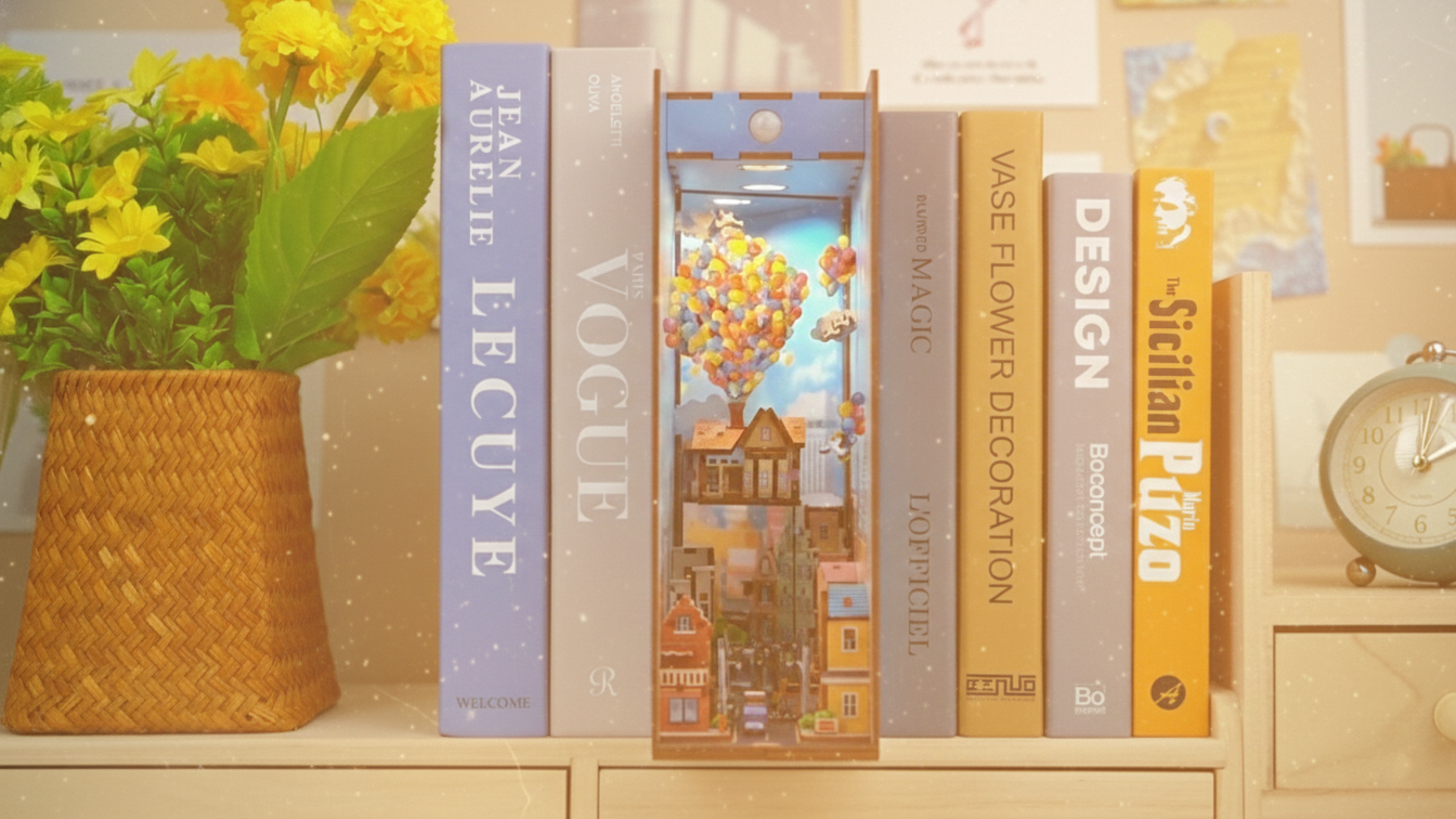 The Travel with the Wind 3D Wooden Puzzle DIY Book Nook Kit lets you build a tiny world where a cottage floats above a city, lifted by rainbow balloons!