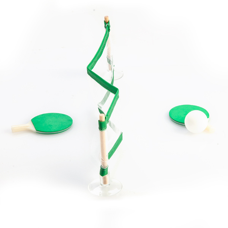 Includes: 2 mini paddles (4.5cm wide), 1 mini ball (1.9cm diameter), and a fully trimmed net with suction cups and dowel to assemble (30.5cm long)!