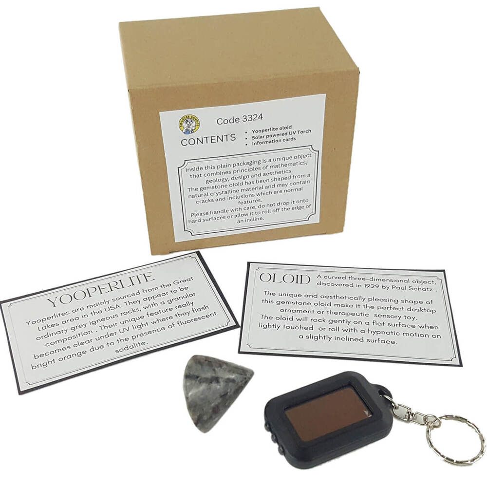 You will receive: 1 x Yooperlite Oloid gemstone with fact card, plus 1 x Solar powered UV torch (no batteries required). It comes gift boxed.